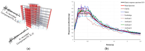 A nonlinear dynamic analysis was performed with seismic inputs described by bi-directional recorded accelerograms (Figure 2a), which have been applied at base level. Figure 2b shows the response spectra of the selected accelerograms compared to the EC8 elastic response spectrum Type 1, with peak ground acceleration equal to 0.3 g, ground type B, and 5% damping.