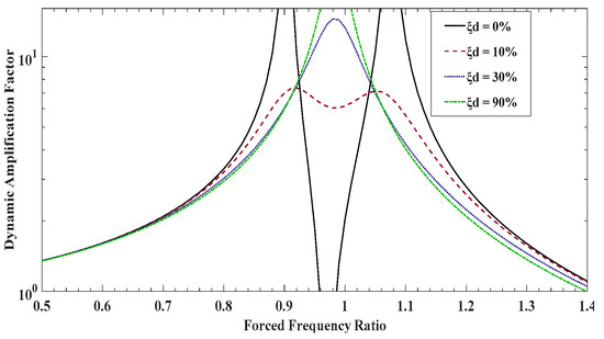 An appreciation of TMD efficiency can be obtained by following the basic development of Den Hartog [6], which considers an undamped structural system subject to a sinusoidal excitation. Figure 4 shows that the dynamic amplification factor, , which takes the damping effect of the TMD, is a function of the four essential variables: the mass ratio , the TMD damping ratio (, the frequency ratio (, and the forced frequency ratio (, where and are the natural frequency of the structural system and TMD, respectively. The dynamic amplification factor is expressed by the Equation (1):