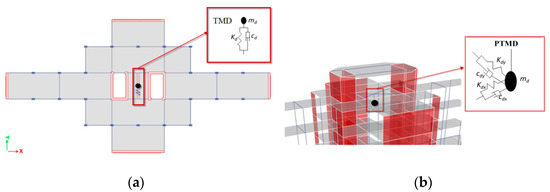Modeling configuration of (a) TMD for low-rise and mid-rise buildings, (b) PTMD for high-rise building.