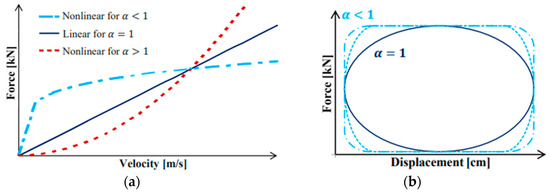 The coefficient is the first important parameter to verify which could be less or equal to 1. Figure 7a describes the force-velocity relationship for linear and nonlinear behavior, while Figure 7b shows the force–displacement hysteretic loops. For earthquake resistance structures, the coefficient has a value ranging from 0.3 to 1.0, in order to provide larger forces and to minimize shocks for high velocities with no degradation of performance [46]. In addition, the lowest value needed to maintain a high amount of energy absorbed per cycle of vibration is shown in Figure 7b, and minimizes at the same time the stress at adjacent structural members [47]. So, in our study, an α value equal to 0.3 has been selected.