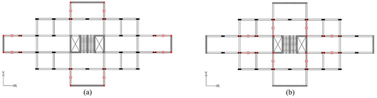 The design optimization of VD is not limited only on the mechanical parameters of VDs, but also on the position of the dampers in the plan-view of the building. It is important to ensure that the dampers are located in a configuration that does not introduce eccentricity to the structure; this is why the most efficient placement would be equivalently about the building’s center of mass, for example, along the perimeter of typical structures. The main reason is to be able to control any torsional motion of the building [47]. In our study, the VDs are positioned in steel diagonal braces, half of them working under compression, and the other under tension. Different configurations of VD’s placement were studied, while two of them are illustrated in the Figure 8. At least two dampers were positioned in each direction and on each side of the building’s center mass at every story, even though it is not required. It could be terminated before the top levels or alternated at different story levels. Moreover, to limit damper force output, more than two dampers per direction could be used, especially for buildings with large footprints.