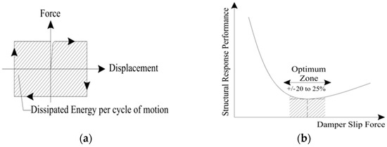 As a result, the force can be written using the following expression , where and represent the frictional and normal forces, respectively, and the coefficient of friction which depends on the selection of sliding materials and present conditions of the sliding interface. and are maintained at constant values over extended durations of time, which is difficult to achieve in practice [3]. The damper hysteresis loop is rectangular, showing a great amount of energy dissipated per cycle of motion, and the cyclic behavior of FD is strongly nonlinear, as shown in Figure 10a. When the friction force is overcome, FD adds initial stiffness to the structural system. It is important to note that if no restoring force is provided, permanent structural deformation may exist after an earthquake [3]. As shown in Figure 10b, the response of the structure is highly affected by FD slip force, and a small variation of FD optimum slip load has a minimum effect on structure’s response. The selected slip force must be high enough to prevent the damper from slipping under a small applied lateral loads value, and should be low enough to achieve slip before the yielding of the main structural elements [54].