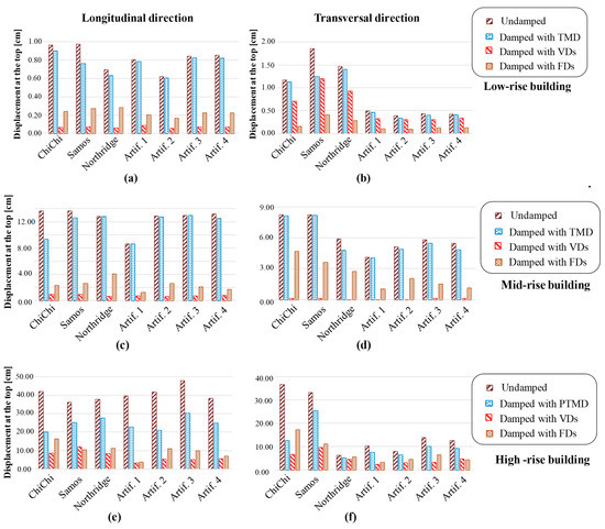 Figure 12 illustrates the horizontal displacement at the top of each building in the longitudinal and transversal direction for the seven accelerograms. The percentage of reduction in the responses for the low-rise building (Figure 12a,b) equipped with friction dampers, in comparison with the structure without dampers, generally exceeds 70.29% in both directions, and reaches 86.10% with ChiChi earthquake excitation in the transversal direction. Although the reduction in the longitudinal direction with viscous dampers is bigger than those obtained with friction dampers, it is limited in the transversal direction, reaching a maximum of 39.49%. As for the damped case with TMD, the percentage of reduction does not exceed 12.94% for all earthquake records except Samos. By evaluating the mean value of percentage reduction in both directions, which is equal to 6.72% and 9.75% with a tuned mass damper, 91.11% and 30.82% with viscous dampers, and 71.44% and 76.87 % with friction dampers, it can be seen that friction dampers perform better than the two other types in the response reduction in the low-rise building.