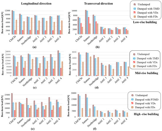 Figure 13 shows the results of the base shear load under the seven seismic ground records for the undamped and the three damped cases. For all damper systems, the ratio between the base shears of models with and without dampers for the low-rise building shows an important reduction (Figure 13a,b). Up to a 76.74% response reduction was achieved with viscous dampers in the longitudinal direction, and a maximum reduction attained by 36.61% in transversal direction. High values of reduction with friction dampers reach 39.93% and 59.14%, respectively, in both directions. With TMD, the percent of reductions are given as about a maximum of 15.74%. By evaluating the mean value of percentage reduction in both directions, which is equal to 2.54% and 5.32% with tuned mass damper, 79.96% and 31.06% with viscous dampers, and 27.38% and 41.66 % with friction dampers, both viscous and friction dampers appear to be effective for the low-rise building in base shear reduction.
