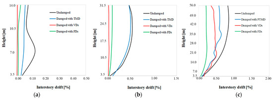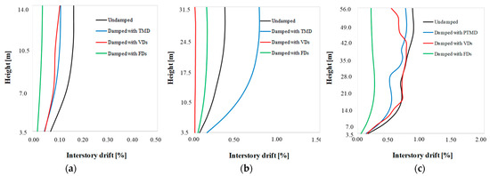 Maximum interstory drift for (a) low-rise, (b) mid-rise, and (c) high-rise building in the transversal direction.