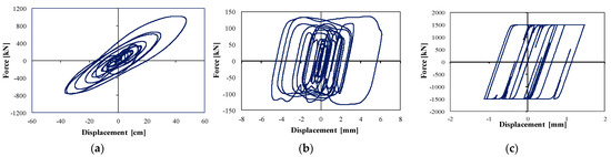 In this section of our study, the hysteresis loops of the three dampers (PTMD, VD and FD) are presented in Figure 16. This figure presents the loops of the real accelerogram of Samos for the high-rise building. The shape of the loops is compared with the expected and well known shape of each damper based on previous studies [1,2,3,15,16,17,21,22,23,24,56,57] and the accuracy of this study is qualitative.