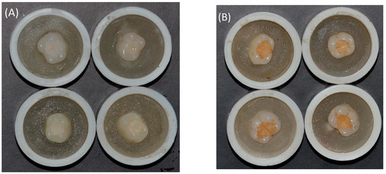 Cleaned cavities were air-dried and restored in two increments measuring 2 mm deep and 2 mm wide for both materials. Resin-based materials were dispensed in a dark container and packed with a plastic instrument and condenser. The restoration material was standardized for each cavity, as the cavity dimensions were similar and the material placement teeth were same for all specimens. In addition, a single operator performed all restorations (KA). Excess material was removed and margins were adapted with a plastic instrument, while the occlusal surface was flat. A mylar strip was covered with a glass slide and the restorative material was photocured for 40 s from the occlusal aspect. A 20 s polymerization exposure process was also performed on buccal and lingual surfaces. Polymerization was performed using an LED light curing unit (3M Elipar Deep Cure-S LED, Minnesota, MN, USA) with a light intensity of 400 mW/cm2 in a uniform, continuous curing mode (Figure 2).