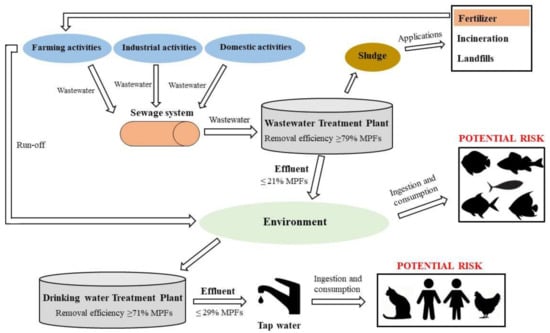 A possible route of entry of MPFs into living beings via WWTPs and DWTPs.