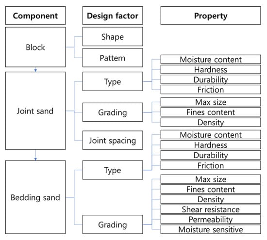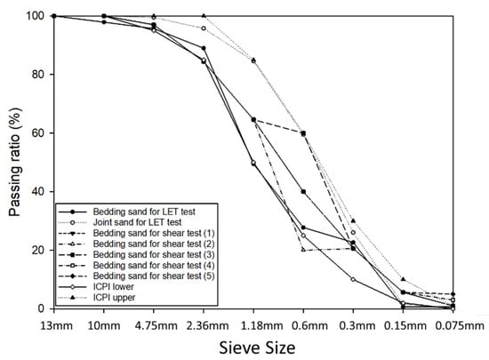 To increase the interlocking effect between blocks and provide a level surface at the bottom, the bedding layer of concrete block pavement is used to fill the empty space at the bottom of the joint to minimize damage caused by the concentrated load. It also levels the lower layer of the concrete block pavement and its finished surface [5]. The thickness of the bedding layer is set to 20–50 mm. The bedding sand layer of a concrete block pavement is not used to secure the bearing capacity, but to make the base and surface layer level with each other. However, when used in a roadway, the bedding sand layer may be crushed by repeated traffic loading, thus affecting the performance of the concrete block pavement. The thicker the bedding layer is, the higher the probability of rutting [6]. Depending on the pavement hierarchy, the requirements of the median particle diameter (600 μm) and fine powder content (75 μm or less) that determine the particle size of the bedding sand are different [7]. The bedding sand, having a low crushing resistance to an external load, is compacted and turned into powder; this reduces the friction between the block and bedding layer, causing the blocks to slide, which leads to the loss of joint sand. Owing to the enlarged joint width, the load transfer efficiency decreases between blocks. When rainwater infiltrates, fine powder of the bedding sand is lost, resulting in damaged concrete block pavement [8]. Beaty (1996) examined the difference in the durability of bedding sand using different rock types through the Lilley and Dowson experiment and found that silica sand was the most durable, followed by granite and limestone. Bedding sand can be evaluated in two ways: properties of sand and properties of materials with reasonable grading [9]. The larger the particle size, the higher the shear resistance, and the better the pavement performance is [10].