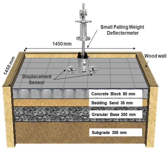 To evaluate the load transfer performance and rotational interlocking effect of the joint, a test pavement was fabricated, as shown in Figure 3. Its dimensions were 1450 mm × 1450 mm, consisting of an 80 mm surface block, a 30 mm bedding sand layer, a 200 mm crushed aggregate base course, and a 300 mm subgrade layer. To measure the load and displacement, Tokyo Sokki’s LFWD and displacement sensors were used. The experiment was conducted by arranging the LFWD and sensors as shown in Figure 4; a weight of 5 kg was dropped from a height of 500 mm and a load of 20 kN was applied. Concrete block shapes, lying patterns, and degree of joint filling were considered as parameters for the experiment. The degree of joint filling was divided into five stages: 0%, 25%, 50%, 75%, and 100%. The LTE was calculated by multiplying the correction factor with the ratio of the deflection measured in D2 and D1, as shown in Equation (1) presented by AASHTO. The rotational interlocking of the concrete block pavement was calculated by Equation (2) using the displacement that occurred at the position where the load was applied and at the opposite end. Data were collected by measuring each parameter 20 times and were averaged to produce the resulting value.