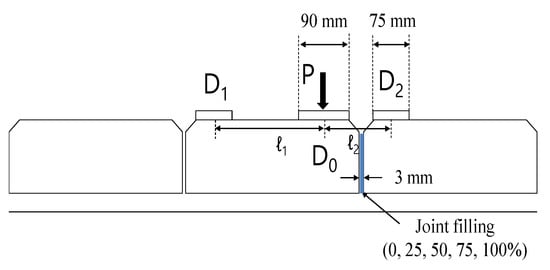 Joint sand is one of the components of the surface layer of concrete block pavement that promotes the load transfer between blocks and distributes the concentrated load. Horizontal interlocking between blocks directly affects the structural strength against horizontal load, depending on the joint material, joint width, block shape, and construction pattern, and exhibits the load transfer between blocks [11]. According to the Japan Interlocking Block Pavement Engineering Association (JIPEA), the load transfer characteristics between blocks are evaluated by measuring the load transfer efficiency (LTE) [12].