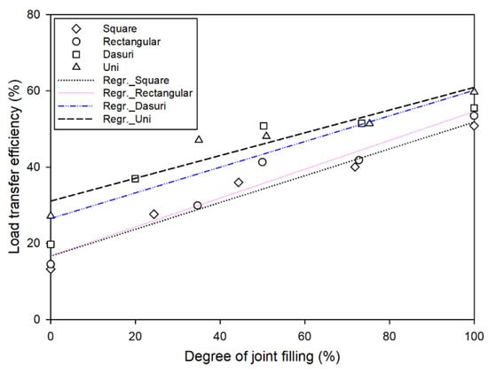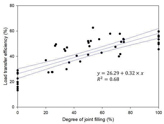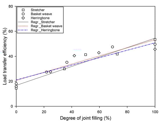 According to a study by Ascher et al. (2006), high vertical deformation occurs when the degree of joint filling is less than 75%, whereas high horizontal deformation occurs when it is 0% [19]. If the joint is fully filled, the block thickness and bedding material have no impact on the deformation resistance of the concrete block pavement. Figure 8 shows the LTE if the degree of joint filling is the only parameter regardless of the block shape and lying pattern. A linear regression analysis showed a regression coefficient of 0.68, indicating a correlation. According to Ascher et al. (2006), if the degree of joint filling is 75% or more, the required LTE is approximately 50% or higher [19]. If more than 25% of the joint sand is lost, maintenance is needed to ensure the performance of the concrete block pavement.