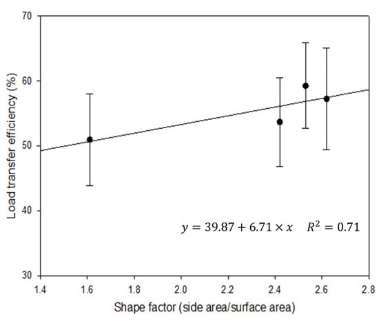 First, the difference in load transfer characteristics was examined when the four selected blocks were laid in a stack pattern. Figure 5 shows the LTE by block shape for the stack pattern. It was found that the LTE increased in all block shapes as the degree of joint filling increased, and the minimum difference between 0% and 100% joint filing was approximately three times. When the joint sand was 100% filled, the Uni and Dasuri blocks showed similar load transfer performance, which was approximately 5% higher than that of the square and rectangular blocks. Figure 6 shows the relationship between the shape factor and LTE: a proportional relationship is seen. It can be seen that the load transfer characteristic between blocks is affected a bit by the block shape, but it is significantly affected by the degree of filling of the joint sand.