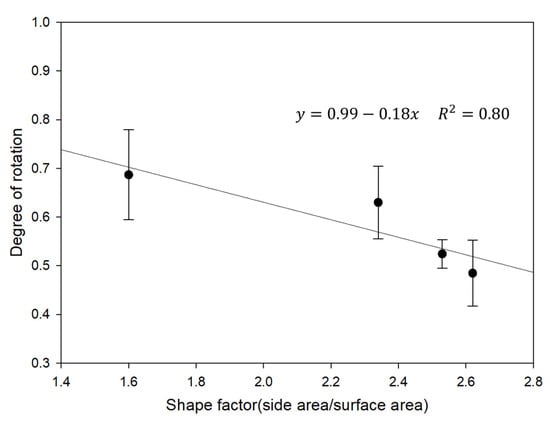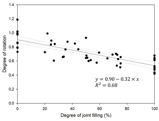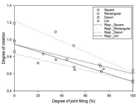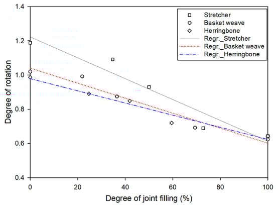 Figure 10 shows the relationship between the shape factor and the rotation angle, which is found to be inversely proportional. This suggests that the rotational interlocking of a concrete block pavement is influenced by the block shape. In Figure 11, the change in the rotation angle depending on the degree of joint filling is seen to be the greatest in the stack pattern. It appears that the basket weave and herringbone patterns have a similar change in gradient, and the change in rotation angle is small. In addition, the rotation angle according to the block construction pattern and degree of joint filling is initially in the range of 1.0–1.2° depending on the block shapes or construction patterns, but it converges to approximately 0.6° if the joint filling is 100%. This indicates that the degree of joint filling has a greater influence on the rotation angle of a concrete block pavement than block shapes and lying patterns. Similar to the load transfer characteristics, rotational interlocking also has a greater impact on the degree of filling of joint sand than the other two. Figure 12 shows the rotation angles by placing a parameter only on the degree of joint filling regardless of the block shape and lying pattern. A linear regression analysis shows a regression coefficient of 0.61; when 75% or more of the joints were filled, the rotation angle of the block was not significantly different from when 100% of the joints were filled. Therefore, if the joint is required to be filled 75% or more, the rotation of the block must remain at 0.6° or below. This means that if the joint is not filled or interlocking forms between blocks, the rotation should not exceed 0.6°.