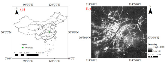 Location of Wuhan (a) and its nighttime light data after preprocessing (b).