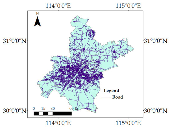 The city roads used in this study to test the extraction accuracy from Luojia 1-01 nighttime light data were derived from OpenStreetMap (www.openstreetmap.org/, accessed on 29 September 2021), an online map collaboration program that was established by Steve Coast in July 2004. As an open community formed by millions of cartographers, OpenStreetMap aims to provide free map data to the public with high accuracy and timeliness. The data are updated and maintained every day by over 1.5 million map editors through aerial images and high-precision GPS data. The data we downloaded from the OSM website included the road networks of Wuhan. The dataset was obtained in January 2018. The city roads extracted from OSM data are shown in Figure 2.