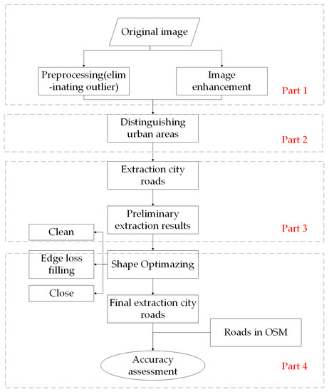 The proposed approach consisted of four parts, which are described in Figure 3. The three steps were as follows: (1) Image enhancement: Image sharpening was conducted to increase contrast of original Luojia 1-01 image, thus improving the characteristics of city roads. (2) Distinguishing of urban regions: Different from high-resolution images, the light intensity in nighttime light data is highly correlated with human activities and regions’ development degree. The light intensity in rural areas was too weak to extract the roads. Therefore, the extraction process could just be conducted in urban regions. (3) Road extraction: An unsupervised neural network-PCNN was established to extract the road networks in urban regions. The aim of the PCNN was to identify the objects edges in an image. (4) Shape Optimizing: A series of optimizing operations were proposed to eliminate the residential regions along the roads and extrude the shape or extracted roads. The final extraction results after shape optimizing were then compared with OSM (OpenStreetMap) data.