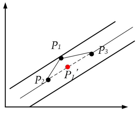 - Edge loss filling: Due to the existence of vehicles, trees, shadows, ground noises or data loss, some road pixels, especially those located in the road edge, can be some tiny cavities with 0 light intensity, which can cause edge loss in final extraction results and influence the integrality and continuity or road networks. Therefore, we adopted this operation to fill up the tiny cavities in binary images. The main steps were as follows: searching for a potential road path, which can be realized by connecting furcate road pixels with terminal road pixels; calculating the average road width and comparing average road width with the width of each road unit to find out units influenced by cavities and need edge loss filling; performing the filling process in edge loss pixels to keep the width of road unit consistent with the average road width. The process can be described as Figure 5, where a short part of road is observed as narrower than the main part, caused by background noises or shadows. We recorded the coordinate of the central point of this small part and the central points and of two nearby road units. We adopted the following formulation to calculate the theoretical location of central point without influences from tiny cavities [13]:where is a constant. If , then , ; if , then , . Finally, the road pavements were then filled according to its new central point and average width.