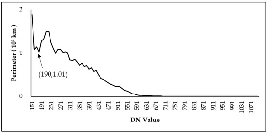 where represents the light intensity, ranging from 0 to the maximum value , and makes the function reach its minimal value. represents the function of urban perimeter and each light intensity value; represents the number of pixels, the DN value of which is . There may exist several values because of the complex city structure. To avoid the data loss, the minimum was considered as the threshold value .