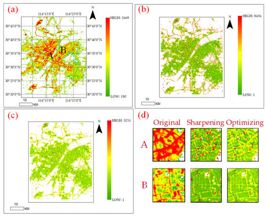After the extraction of urban areas of Wuhan, image sharpening was conducted to the original image. To decrease the noises produced by the sharpening process, a median filter was used. Additionally, the results were compared with the original image and are shown in Figure 8.