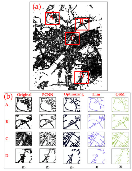 The image after enhancement was then fed into the PCNN to extract the road networks in Wuhan. Four parts, namely A, B, C and D, were chosen as the case areas to show the extraction process. The locations of the four case areas are displayed in Figure 10.