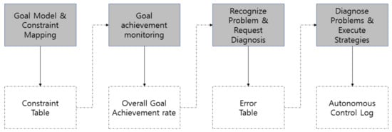 Figure 2 shows the autonomous control process by linking the target model and the error tree. It enables autonomous control in a four-step process: (1) mapping target model constraints, (2) monitoring target achievement rates, (3) recognizing problems and requesting diagnosis, and (4) diagnosing problems and executing strategies [19].