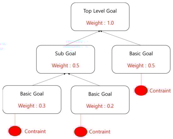 (1) To evaluate the error of a system, a constraint (a criterion for evaluating whether the goal is violated) must be connected to the goal, as shown in Figure 3. At this stage, it becomes a basic model of goal achievement by linking the constraints to the goals of the abstract system.