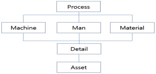 As shown in Figure 5, the process is located at the top, while facilities, workers, and materials are located at the bottom. Equipment, workers, and materials each have detailed information as subordinates, including asset details and detailed data for status values and sub-assemblies. If this is schematized in semantics, it can be expressed as the following figure.