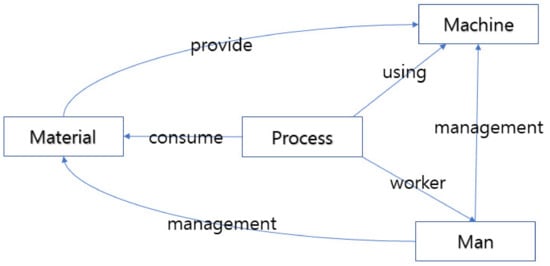 Man can be defined as a worker. Its attributes may include general attributes, such as affiliation, position, years of service, disability, and attitude of the worker. Material indicates the material required for production. It includes the manufacturer, storage location, mixing ratio, and number of days in stock. Method refers to methods, mixing ratios, and order. Machine includes the equipment identification number, use, affiliated process, repair history, maintenance manual, and so on that might correspond to this.