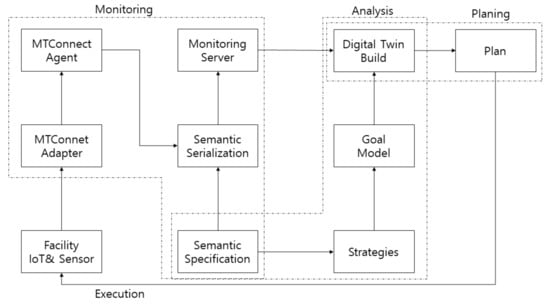 The flow chart of the architecture proposed in this paper is shown in the figure below. The overall structure consists of four areas. The monitoring area collects various data generated from equipment, IoT, and sensors using MTConnect adapter/agent. The collected information is serialized in XML format in accordance with the semantic standard. Through this, a monitoring server is built. In the analysis area, various situations that can occur in the semantic factory are defined in semantic language in advance. The weights for these are defined in the target model through tools, such as decision trees. The problem is identified by analyzing it in the digital twin space implemented based on the data built from a monitoring server. In the planning area, the analyzed problem is planned for preventive maintenance using expert techniques or a set manual. In the execution area, based on the strategy established in the planning area, the situation in the factory is grasped, an execution plan is established, and actual equipment, IoT, and sensors are controlled.