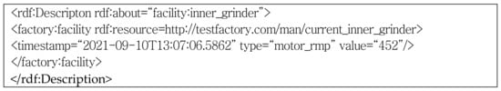 For example, if the rpm of the motor is 452 in the inner grinding process and if the SHDR of 2021-09-10T13:07:06.5862|rpm|532 occurs, <DataItem category =“EVENT”, timestamp = “2021-09-10T13:07:06.5862” id = “2000_Avail”, Type = “motor_rpm”, Value = “452”> is saved by the agent. Meanwhile, the semantic model is composed as shown in Section 3. The data of the lower stage along the semantic hierarchy are stored as the following Figure 12.