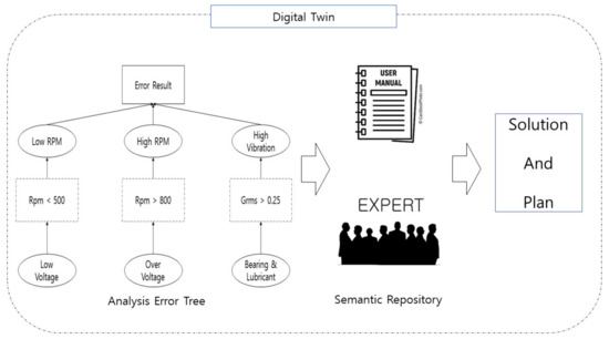 As shown in Figure 13, first, a problem is found through an error tree on a digital twin that is modeled on a virtual factory, and a solution and a plan are established using the semantic repository composed of manuals and coping methods made by experts. For example, if the normal operating value of the motor is 500~800, a low rpm is a warning sign. If this is defined as an error tree, it can be expressed in the following Figure 14.