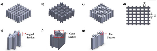 Computer-aided designs of the three different support structures: (a) angled-type (AT53G80), (b) cone-type (CT53G80), and (c) pin-type (PT53G80). (d) The thickness (T) and gap (G) of a support wall are presented from the top view. The cross-section view shows the contact area between the main sample and supports for (e) angled-type (AT53G80), (f) cone-type (CT53G80), and (g) pin-type (PT53G80).