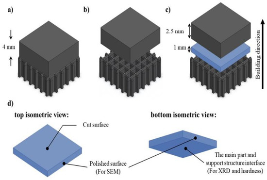 The main samples were removed from the allotted support structures using the Wells No. 12 metal cutting bandsaw (Wellsaw, Three Rivers, MI, USA). An Allied Techcut 4 precision cutter (Allied High Tech, Compton, CA, USA) was then used to cut the bottom portion of the main samples 1 mm above the support/part interface through a plane normal to the building direction. The speed of the cutter blade was set at 100 RPM to obtain a uniform cut. The schematic of the cutting strategy is presented in Figure 3. The polished surface and the surface used to perform XRD and the hardness analysis are as shown in Figure 3d.