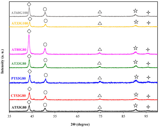 In terms of the position of the peak angle, we can see that there is a variation for the γ (111) diffracted angle between samples. The 2θ location of the detected γ peaks is listed in Figure 6. When comparing the samples fabricated with different types of supports, the highest increase in the diffraction angle can be seen for the Pin-type support (PT53G80), followed by the cone-type (CT53G80). The geometrical parameters (i.e., thickness and gap) also affected the position of the diffraction angle (2θ). Reduction in the thickness of the supports (T) led to the increase in the diffraction angle, for both cases of AT80G80 and AT33G80, and AT60G100 and AT33G100. By comparing the AT33G100 and AT33G80, it was found out that a decrease in the gap value reduced the angle of diffraction.