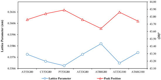 Based on the variation observed for the diffraction angle, the lattice parameter can be calculated for each sample using the Bragg’s law equation which relates the interplanar distance and the lattice parameter: