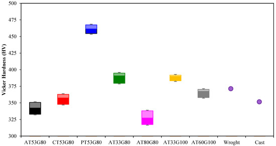 Among seven samples, AT80G80 has the highest total cost of $171.71 and the highest total support cost of $61.44; AT80G80 demonstrates the lowest level of Vickers hardness (as shown in Figure 9). This indicates an interesting opportunity for improving the hardness level and reducing cost simultaneously. In addition, different types of the support structure (AT53G80, CT53G80, and PT53G80) show dramatically different levels of hardness (from around 330 to around 460, indicating almost 40% improvement) but they have similar total costs (from $171.68 to $171.69). In other words, adjusting the type of support structure could achieve better hardness “for free”. Next, we focus on the same support structure but different geometries, i.e., different thicknesses (AT53G80, AT33G80, and AT80G80; AT33G100 and AT60G100) and different gap (AT33G80 and AT33G100). Samples with different thicknesses demonstrate evidently different levels of hardness and different total support costs while having similar total costs. For example, AT80G80 ($61.44) has around 35% more total support cost than AT33G80 ($45.54), and AT80G80 also demonstrates a lower hardness (around 325) than AT33G80 (around 380). On the other hand, samples with different gaps have a similar level of hardness and similar costs. AT33G80 and AT33G100 have similar averaged hardness (around 380) with different standard deviations, and similar total cost and total support cost.