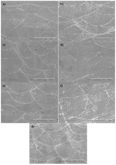 The SEM micrographs of the IN718 parts fabricated on top of different support structures: (a) AT53G80, (b) CT53G80, (c) PT53G80, (d) AT 33G80, (e) AT80G80, (f) AT33G100, and (g) AT60G100.