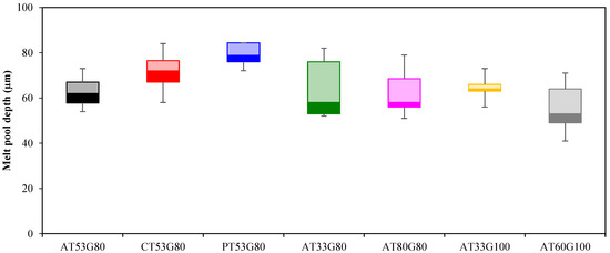 The melt pool depth of the IN718 LPBF parts fabricated on top of support structures with different types (AT53G80, CT53G80, PT53G80) and geometries (AT 33G80, AT80G80, AT33G100, AT60G100).