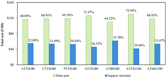 It can also be observed from Table 5 that different specimens have similar cost distributions among three cost components: fixed cost, indirect cost, and direct cost. As example of cost distribution among different cost components is shown in Figure 10 for specimen AT53G80. The cost calculation results in Figure 10 show that the fixed cost has the largest contribution at 84.17%, the direct cost is around 15.55% of the total cost, and the material-related direct cost is only less than 1% of the total cost. This indicates that in AM practices, despite the fact that raw material powders seem to be expensive, the material cost can be neglected compared to other consumables and machine setup and maintenance. In addition, the cost distributions among the main part and the support structure are shown in Figure 11. Among samples with different support structure types and geometry, their contribution to the total cost is similar, ranging from 24.06% (AT33G100) to 35.78% (AT80G80). The reason for this difference is mainly due to the support structure geometry (both thickness and gap). In addition, samples AT53G80, CT53G80, and PT53G80 demonstrate similar cost performance, indicating that the support structure type (angled, cone, and pin) does not evidently alter the cost contributions between the main part and the support structure.