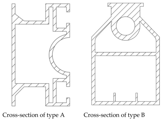 The material of the spray boom is aluminum alloy 6063-T5 that has two cross-section structures (Figure 4). When the spray boom is working, the long side of the cross-section is vertical, and the short side is horizontal. The type A cross-section structure of the spray boom is used in this experiment. Related parameters are shown in Table 2.