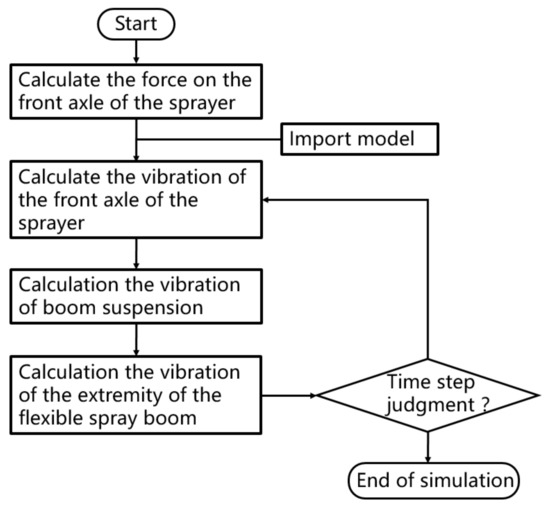 When the boom sprayer passes through an obstacle at a certain speed, it is like being excited by a step. The upward force exerted by the obstacle on the boom sprayer was obtained by simulation on the multi-body dynamics software RecurDyn [24]. The speed of the boom sprayer in the field is about 6 . In RecurDyn, the conditions of passing through 0.1 × 0.1 m obstacles at three vehicle speeds of 4, 6, and 8 were simulated, and the upward force on the front axle of the boom sprayer was about 4800, 5200, and 6320 N. The time for the front wheels to pass the obstacle was about 0.09, 0.06, and 0.045 s, respectively. Then, relevant model parameters were set according to Table 1 and Table 2. The dynamic response simulation of the spray boom is shown in Figure 5. First, the force on the front axle of the boom sprayer was calculated. Then, the dynamic model was imported. Third, the vibration of the front axle was calculated. Fourth, boom suspension vibration was calculated. Fifth, vibration of the extremity was calculated. Sixth, whether the number of iterations was reached was judged; if not, the simulation was continued; if yes, the simulation ended.