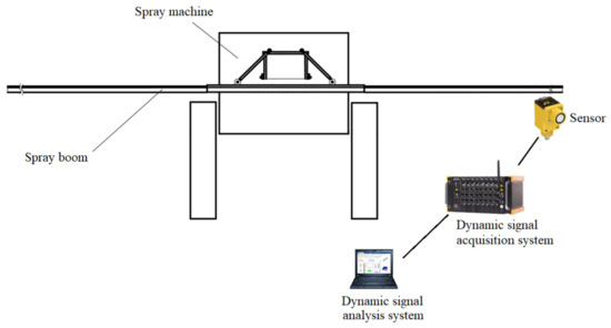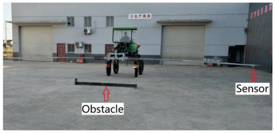 To verify the accuracy of the mathematical model, a DH5902 vertical vibration test system for the spray boom (Jiangsu Donghua Testing Technology Co., Ltd., Changzhou, China) and a Q45u multifunctional ultrasonic sensor (Banner Company, Tokyo, Japan) were used (Figure 6). The ultrasonic sensor has an effective detection distance from 250 mm to 3.0 m, an operating temperature range of −25 to +70 °C, upper sampling frequency of 100 Hz, and sensitivity of 100 . The sensor was fixed on the extremity of the spray boom of the SWAN3WP-500 self-propelled boom sprayer. The sensor was powered by the DH5902 test system and received the collected data. The sensor used a 100 Hz sampling frequency real-time recording of vertical vibration at the extremity when the dual front wheels of the boom sprayer passed a 0.1 × 0.1 m square obstacle on the ground. The vertical response data of the extremity were finally received and stored by a DHDAS dynamic signal acquisition and analysis system on the computer.