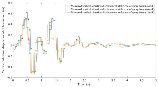 Vertical vibration of the extremity of the spray boom was tested on the ground (Figure 7), and 18 groups of response data were obtained. The effective data time is less than 5 s. Results show that the spray boom is affected by engine vibration and other external factors when the boom sprayer is running on horizontal ground. The maximum allowable vibration error at the extremity tested by the ultrasonic sensor is ±0.05 m. The typical vibration response curves of the spray boom at the first 5 s of three speeds are illustrated in Figure 8. When the boom sprayer passes through obstacles at a traveling speed of 4 , the vibration at the extremity of the spray boom maximizes, which is about 0.628 m upward vibration. With an increase in the traveling speed, the vibration amplitude of the extremity decreases and is reduced obviously, especially when the speed is accelerated from 4 to 6 . Under the three speeds, the maximum amplitude of downward vibration at the extremity changes very little and is about 0.537 m. As the traveling speed of the boom sprayer rises, the frequency of the extremity of the spray boom is increasing, further proving that the spray boom and suspension can drive the spray boom to follow the low-frequency components of the ground, while isolating the fluctuation and inclination of high-frequency components. The vibration curve shows that the spray boom during vibration is affected by different parts of the boom sprayer body, spray boom suspension and vibration frequency, resulting in the interval small amplitude vibration. Due to the relative friction caused by the relative motion of each part of the boom sprayer in the vibration, the vibration waveform clips and distorts. The vibration of the spray boom is mainly concentrated in the first 3 s and decays rapidly after 3 s.