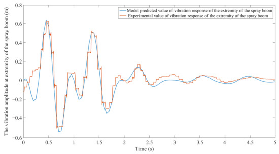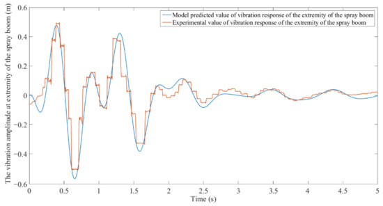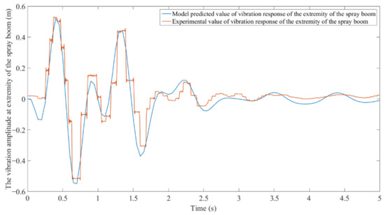 Model predicted values and experimental values of vibration response of the extremity of the spray boom when the boom sprayer passes through obstacles at 6 .