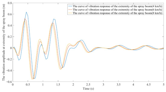 When the boom sprayer passes through the obstacle at a certain speed, it is as if it is subjected to a step excitation, and the upward force of the obstacle on the boom sprayer can be determined by the multi-body simulation on RecurDyn. The speed of the boom sprayer is about 6 in the field operation. On RecurDyn, the force of the front axle when the boom sprayer passed through a 0.1 × 0.1 m obstacle at 4, 6 or 8 was simulated. Results show the upward force on the front axle is about 4800, 5200, 6320 N, and the time for the front wheels to pass through the obstacle is about 0.09, 0.06, and 0.045 s, respectively. Relevant parameters were substituted into the vibration model of the spray boom, and the vertical vibration displacement curves of the extremity of the spray boom at 4, 6, and 8 were plotted (Figure 12).