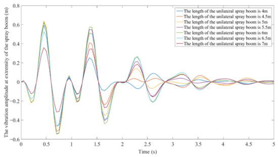 The previous section verifies the accuracy of the geometric continuous model of the spray boom based on multi-body vibration. This section discusses the influence of lengths of the unilateral spray boom on the vertical vibration of the spray boom. Figure 13 shows the vertical vibration at the extremity of the unilateral spray boom with seven lengths of type A cross-sectional structure when the boom sprayer passes through 0.1 × 0.1 m square obstacles at a speed of 6 . With an increment in the length of the unilateral spray boom, the amplitudes of the first and second peaks of vertical vibration increase slightly and greatly respectively, indicating that when the cross-section is the same, the elastic deformation of the spray boom is intensified with the increase in its length resulting in increased amplitude at the extremity of the spray boom [28,29,30,31]. When the length of the unilateral spray boom reaches 5 m, the first peak amplitude maximizes and then decreases. When the length of the unilateral spray boom reaches 6 m, the amplitude of the second peak maximizes and then declines. Hence, when the unilateral spray boom is longer than 6 m, with the increase in the length of the spray boom, the spray boom is more prone to elastic deformation under excitation. The influence of excitation on the extremity of the spray boom is gradually reduced when the length of the spray boom exceeds the strength support range of the spray boom structure, and the elastic deformation of the spray boom will inhibit the vibration transmission to the extremity of the spray boom [30,31]. At present, the length of unilateral spray booms manufactured by various manufacturers is less than 6 m.