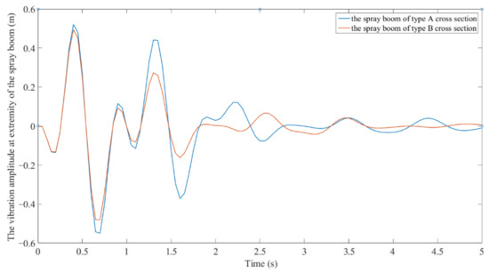 At present, boom sprayers produced by different manufacturers mainly adopt two types of cross-section spray booms (Figure 4). The new geometric continuous model of spray booms based on multi-body vibration is used to analyze the vibration of the spray boom with two cross-sectional structures. Figure 14 shows the vibration of the extremity of the spray boom with a unilateral length of 5 m when the boom sprayer passes through a 0.1 × 0.1 m square obstacle at a speed of 6 . The maximum vibration amplitudes of the two types of spray booms are only slightly different, but the vibration decay speed of the spray boom of type B cross-section is faster compared with type A cross-section. Hence, the type B cross-section outperforms the type A cross-section in suppressing vibration. It is proved that the spray boom with a larger cross-section moment of inertia has a better vibration suppression effect under the same material [32,33,34,35].