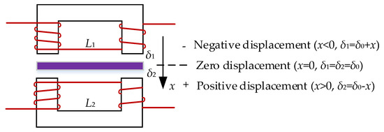 where δ0 is zero gap, Δδ is the armature displacement x, and L0 is the zero position inductance when the armature is located in the center between two probes. L0 can be obtained from Equation (3), that is,
