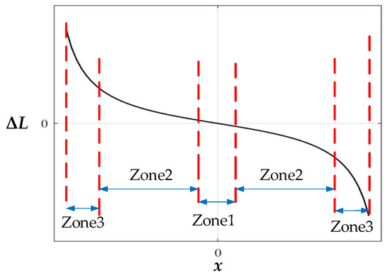 Differential inductive sensors are commonly used for measuring small displacement for their high precision. However, there will be great nonlinearity if they are operated in a large range. We define the armature displacement as x, and the armature displacement at the center of the two probes is zero. ∆L = L1 − L2 is defined as the differential inductance. Figure 3 shows ∆L vs. x nonlinear relationship of the differential inductive sensor operated in large range. The curve can be divided into 3 zones: